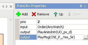 graph navigator_officer { state Start { type initial; arc Stalker_Idle { input true; output OrderMngInit; } } state Stalker_Idle { arc Stalker_WaitOrder { prio 2; % As result of interface command (camera focus on character) input Camera(on); output EyeballSetTarget(CrtCamera); output PlayAnimIntr(NA_turn_d); } arc Stalker_ExecuteOrder_Talk { prio 2; input Order(AnyNavigation); output PlayAnimIntr(NA_confirm); output PlayMsg(ChE_K_,Yes_Sir); } ... } ... }