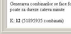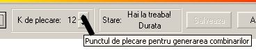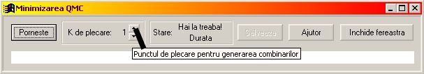 Cand se porneste minimizarea, programul incearca sa vada daca nu cumva ajunge un singur termen. Daca nu ajunge unu, incearca cu doi. Si asa mai departe. Operatia dureaza mai multe ore chiar si pe calculatoare performante. Sa presupunem ca aplicatia a ajuns sa incerce combinari de 29 luate cate 12 (K=12), fapt afisat in fereastra, si dintr-un motiv sau altul trebuie sa oprim procesul de minimizare. Data viitoare cand intram in fereastra putem folosi control spin (cel indicat in imagine) pentru a seta numarul K de plecare la 12.